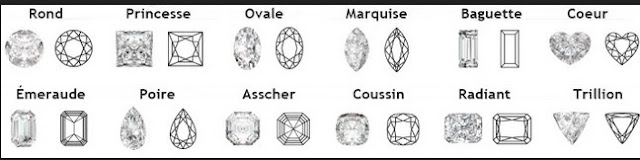 La taille la plus commune est le Diamant de taille Brillant (Rond). Ensuite vous avez le choix entre les tailles Princesse (Carré taillé à la façon d’un brillant), Émeraude, Marquise, Poire, Ovale, Cœur, Etc.…